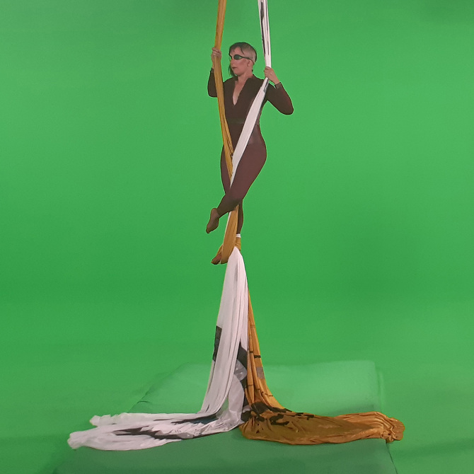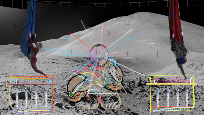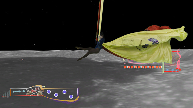 In "2092: Tale of moon trip”, Kunlin has worked with local bay area choreographist, Cherie Carson who design six dance movements, which about belief, visual experience, love, death, gender, environmental issues, and the local lunar art on the moon. Aerial dance is a genre of modern dance, invented by San Francisco choreographist, Terry Sendgraff during the space race. Terry simplifies circus acrobatics and Chinese acrobatic dance, adapted to a dance model that is more efficient to improve the physical body of dancers. Terry’s style, Motivity, is an improvisation-based dance form and performance art. It often includes the use of a suspended apparatus, in particular the single-point low flying trapeze, which Terry designed in 1976.