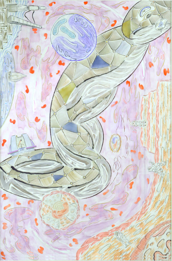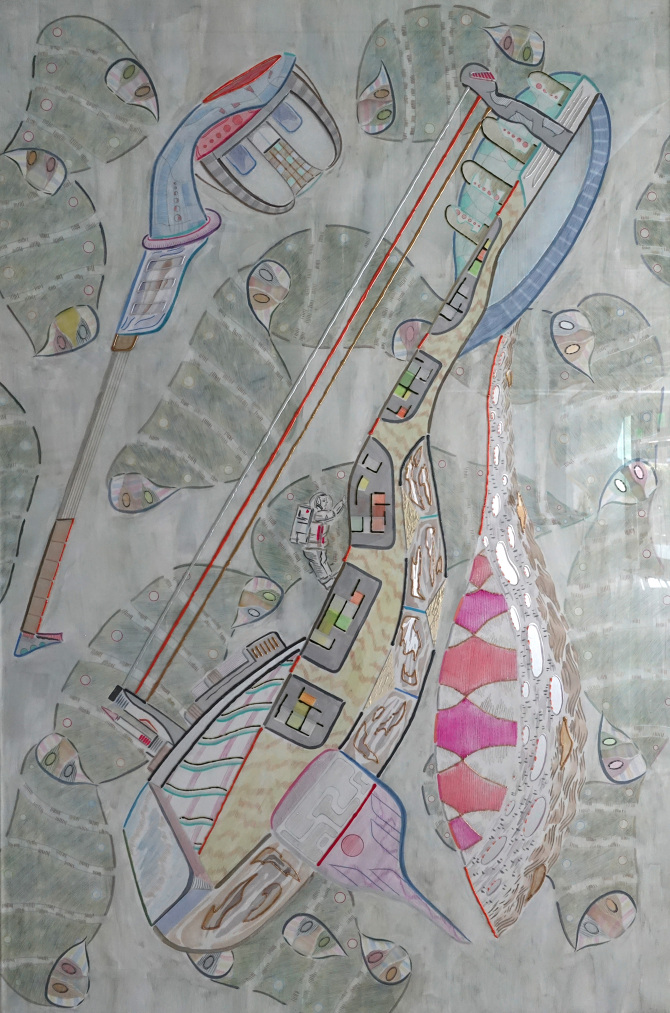 Acrylic and ink drawing on three difference layers (bottom: aluminium, middle: mylar, top: acrylic sheet)/ 132(L) X 72(W) inch/