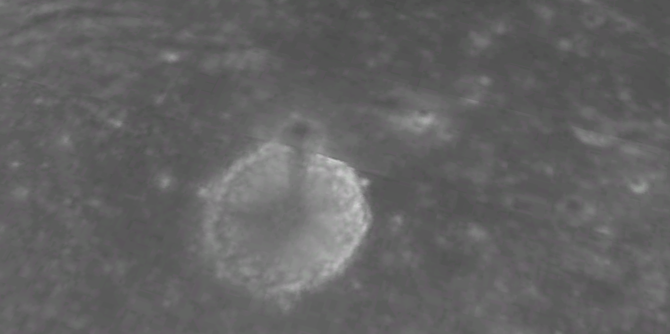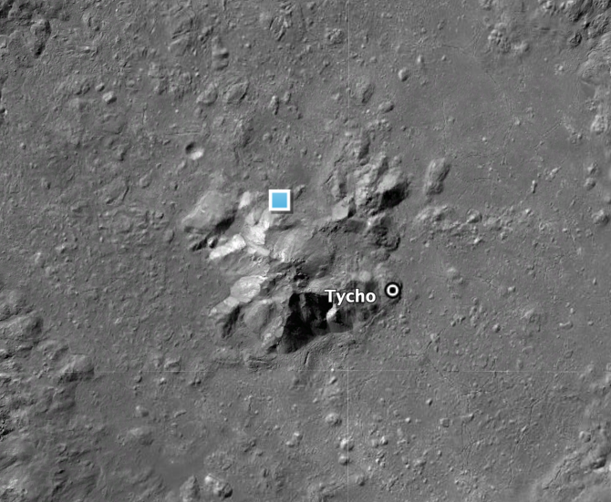 接下来我们要穿越1242miles的月海到月球最著名Tycho陨石坑。月球上,大部分陨石坑都有接近39亿年的历史,但这座陨石坑确非常之年轻,只有1亿年左右的历史,Tycho陨石坑直径53miles,有着非常优美的边缘线。现在我们朝着Tycho凸起的山脉缓缓降落,请大家注意留心山脉的形态,看看能不能找到一个张着嘴吐舌头的蜥蜴脑袋,以及它下方的爪子与背部的尾巴。当地人把这座山脉称之为——守护神《哥斯拉》。