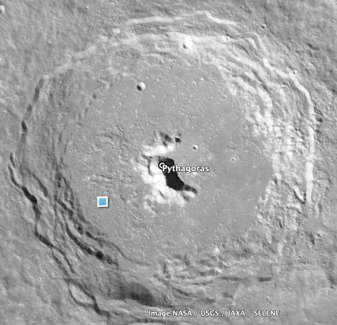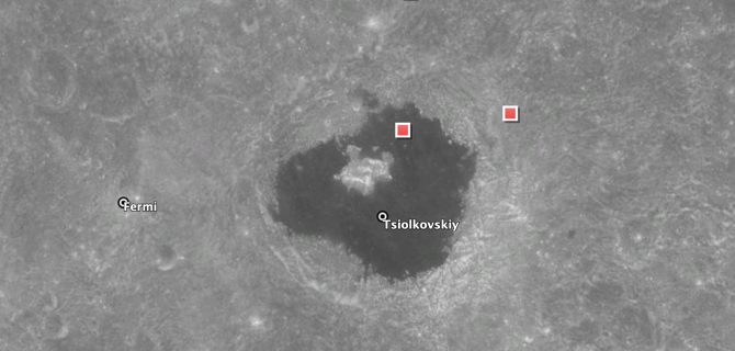 好的,我们现在已经到达了月球背面的景点,也是背面唯一的一个景点。只要大家现在朝向窗外,就能很容易的发现这座月海。它位于月球的西面,面积并不大,直径大概80miles左右,最早以一位19世纪的苏联火箭专家Konstantin E. Tsiolkovsky的名字命名,现在基本上没有人会记得它最初的名字,因为我们都叫它《悲情湖》。