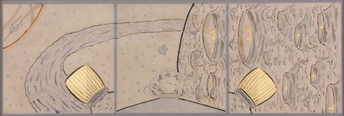 Acrylic and ink drawing on three difference layers (bottom: brass, middle: mylar, top: acrylic sheet)/ 37(L) X 12 1/2(W) inch/